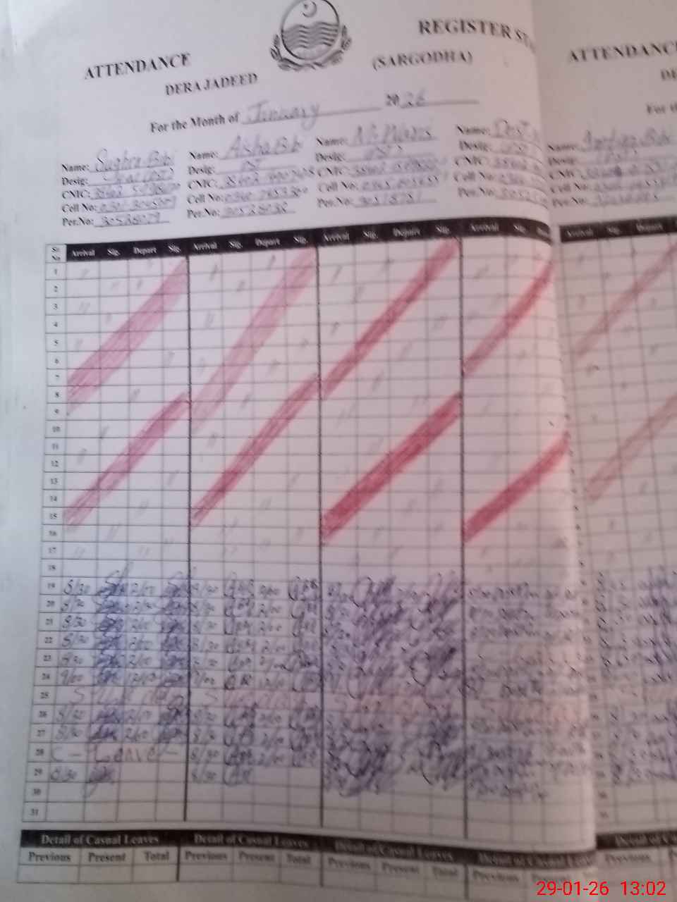 | CNIC | Full Name | Designation | R/C | Absence During Last Calender Month |