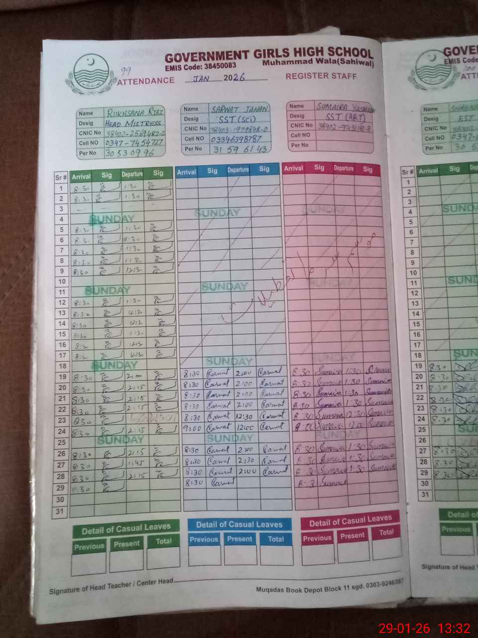 | CNIC | Full Name | Designation | R/C | Absence During Last Calender Month |