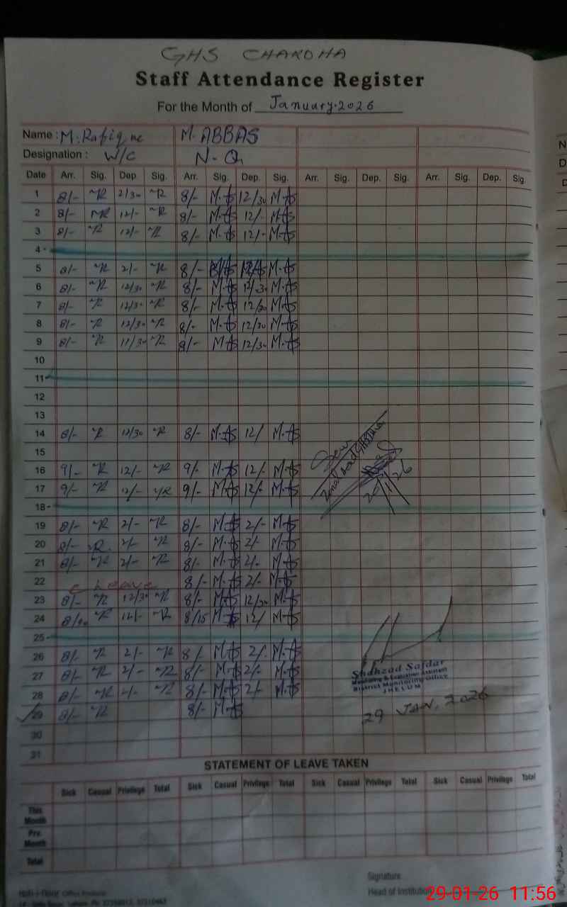 | CNIC | Full Name | Designation | R/C | Absence During Last Calender Month |