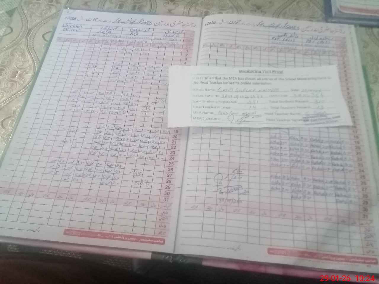 | Attendance Register | Head Teacher | MEA with School | Visit Proof |