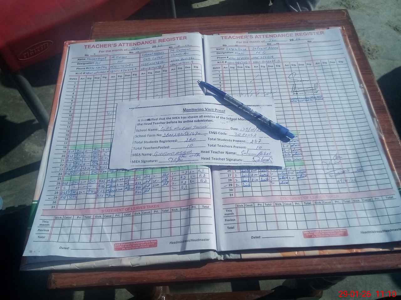 | Attendance Register | Head Teacher | MEA with School | Visit Proof |