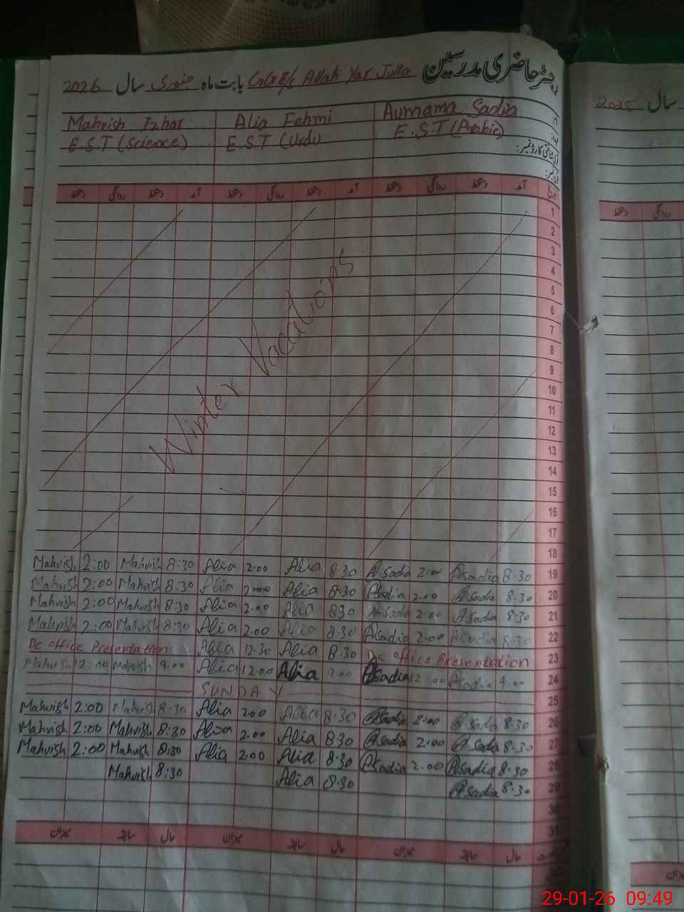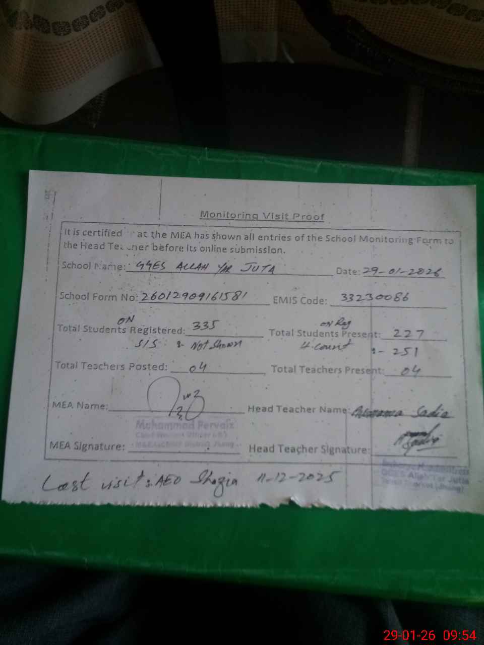 | Attendance Register | Head Teacher | MEA with School | Visit Proof |