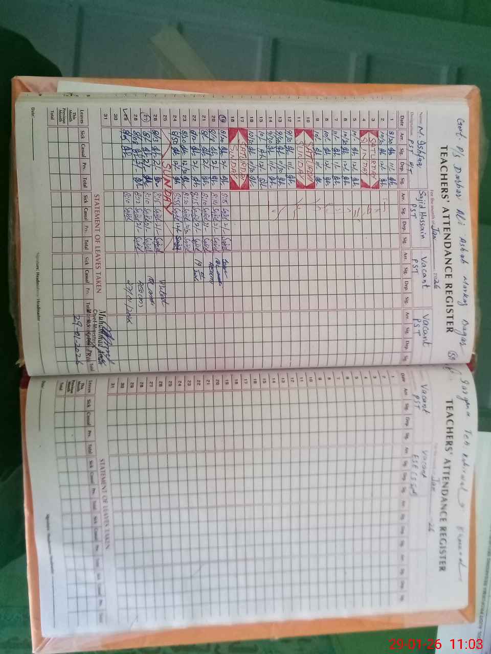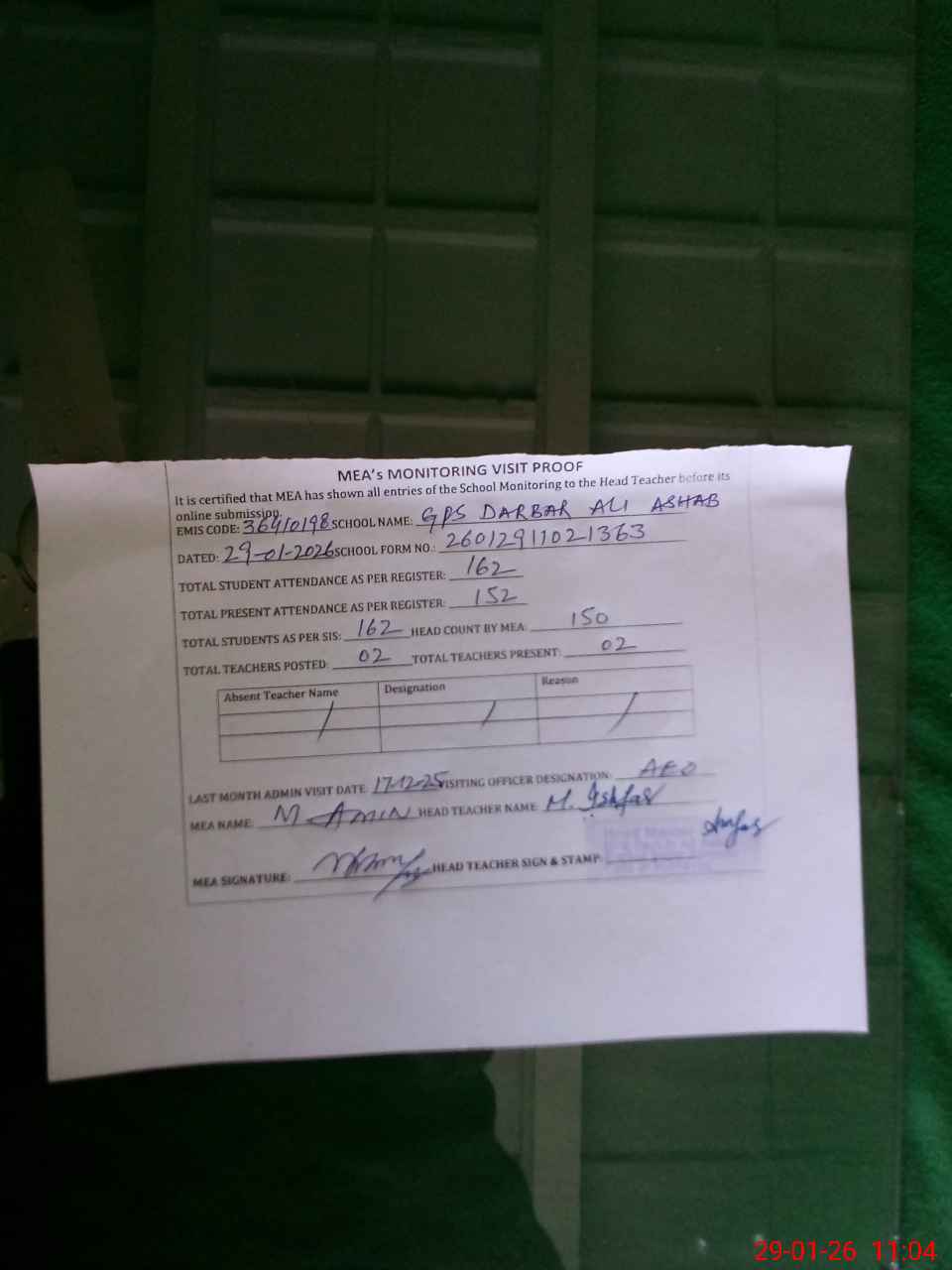 | Attendance Register | Head Teacher | MEA with School | Visit Proof |