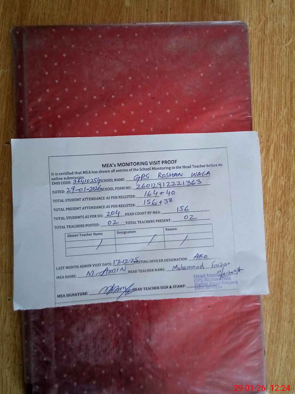 | Attendance Register | Head Teacher | MEA with School | Visit Proof |