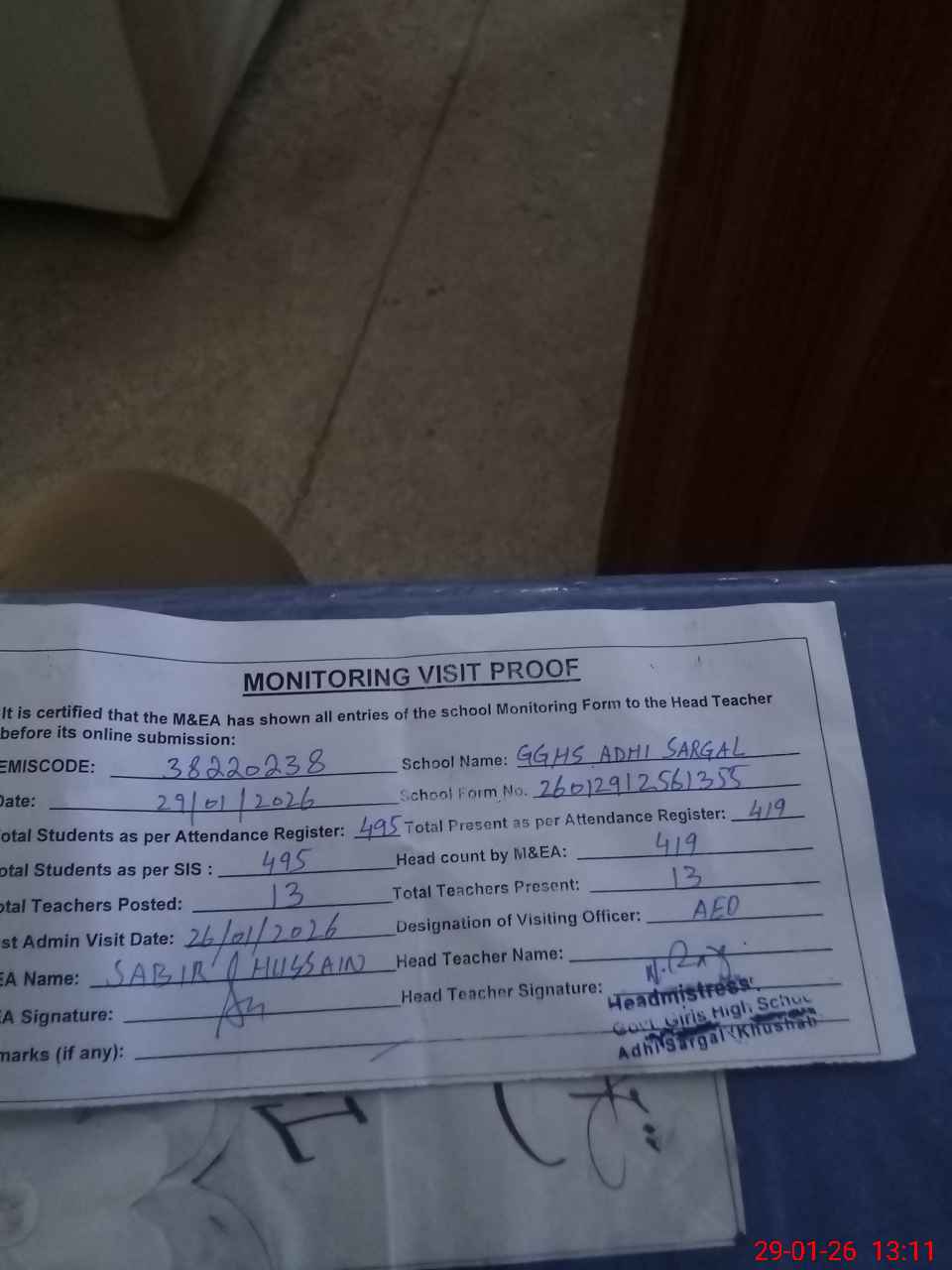 | Remarks (Use Separate Page if Required): no teacher absent total students on register 495 total students on SiS 495 Last admin visit by AEO 26 Jan 2026 | |||||