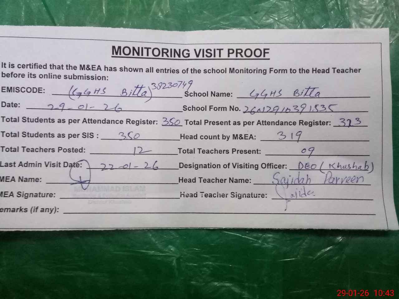 | Remarks (Use Separate Page if Required): DEO visited school on 22 January 2025 students strength on sis 350 2 classes sitting under shade as they have no class rooms | |||||