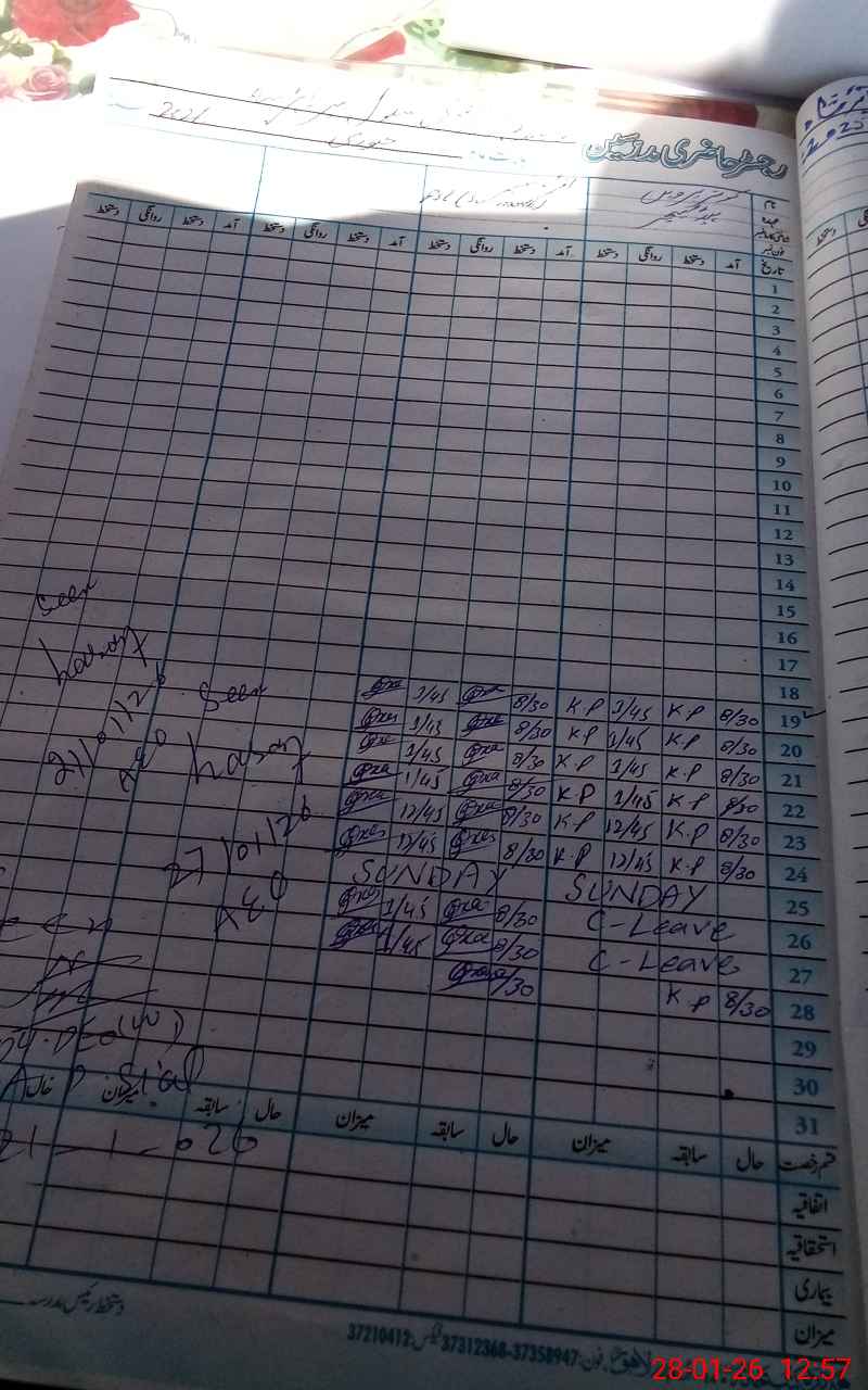 | CNIC | Full Name | Designation | R/C | Absence During Last Calender Month |