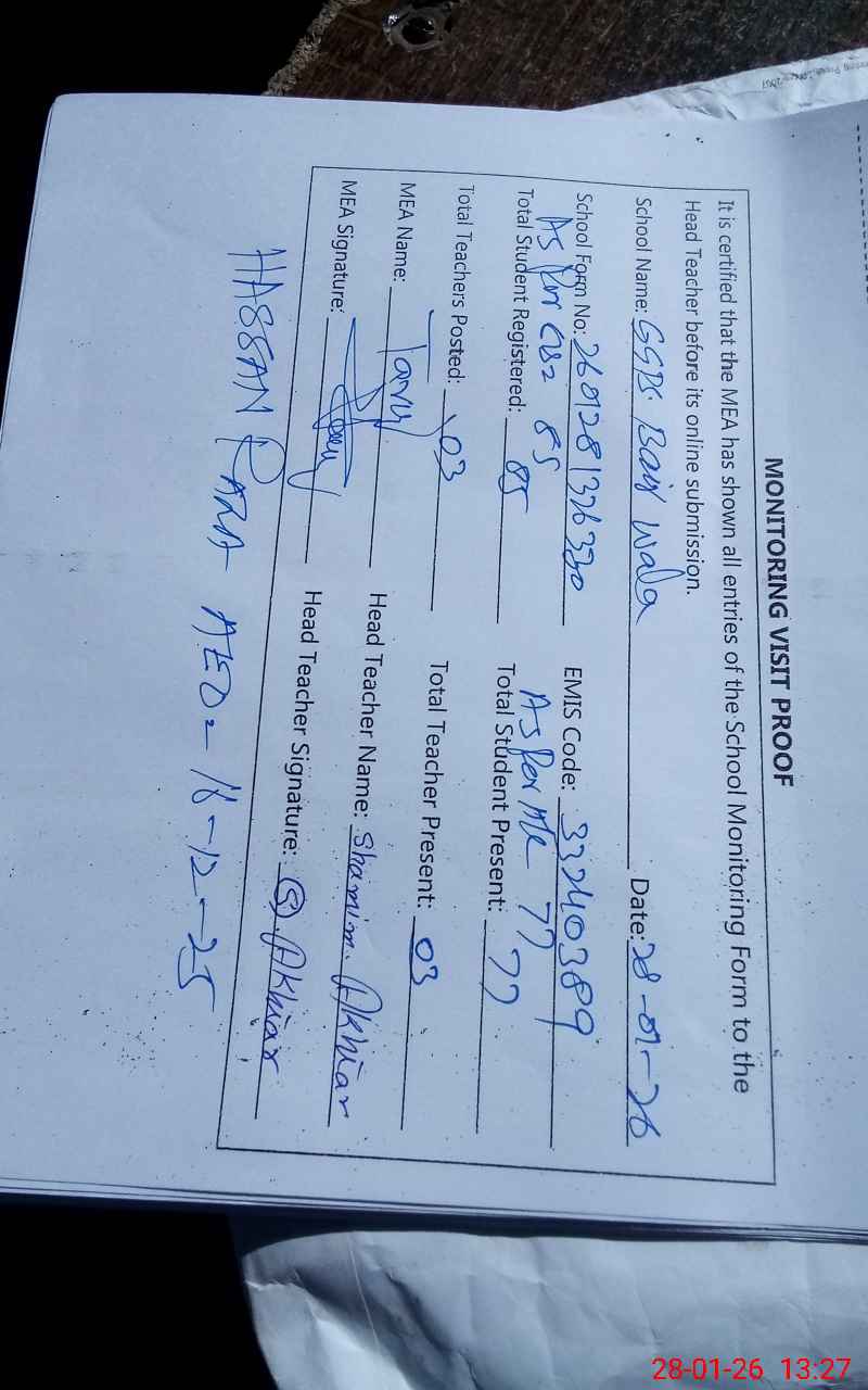 | EMIS Code: 33240389 | Name of School: GGPS BAIR WALA BAHAR | |||