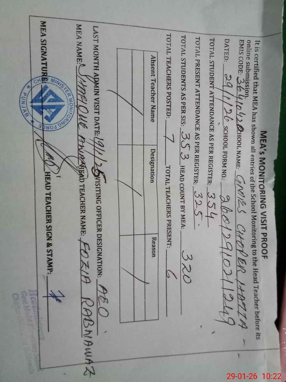 | Attendance Register | Head Teacher | MEA with School | Visit Proof |