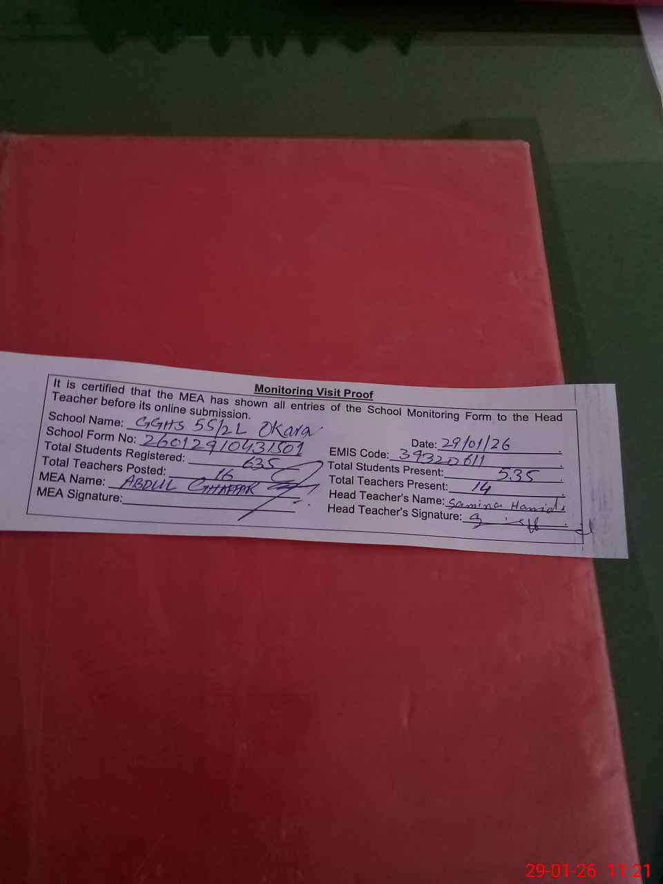 | Attendance Register | Head Teacher | MEA with School | Visit Proof |