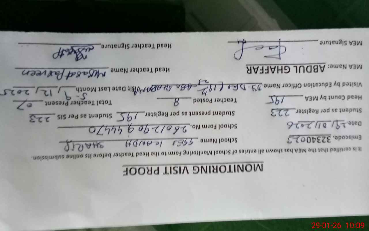 | Attendance Register | Head Teacher | MEA with School | Visit Proof |