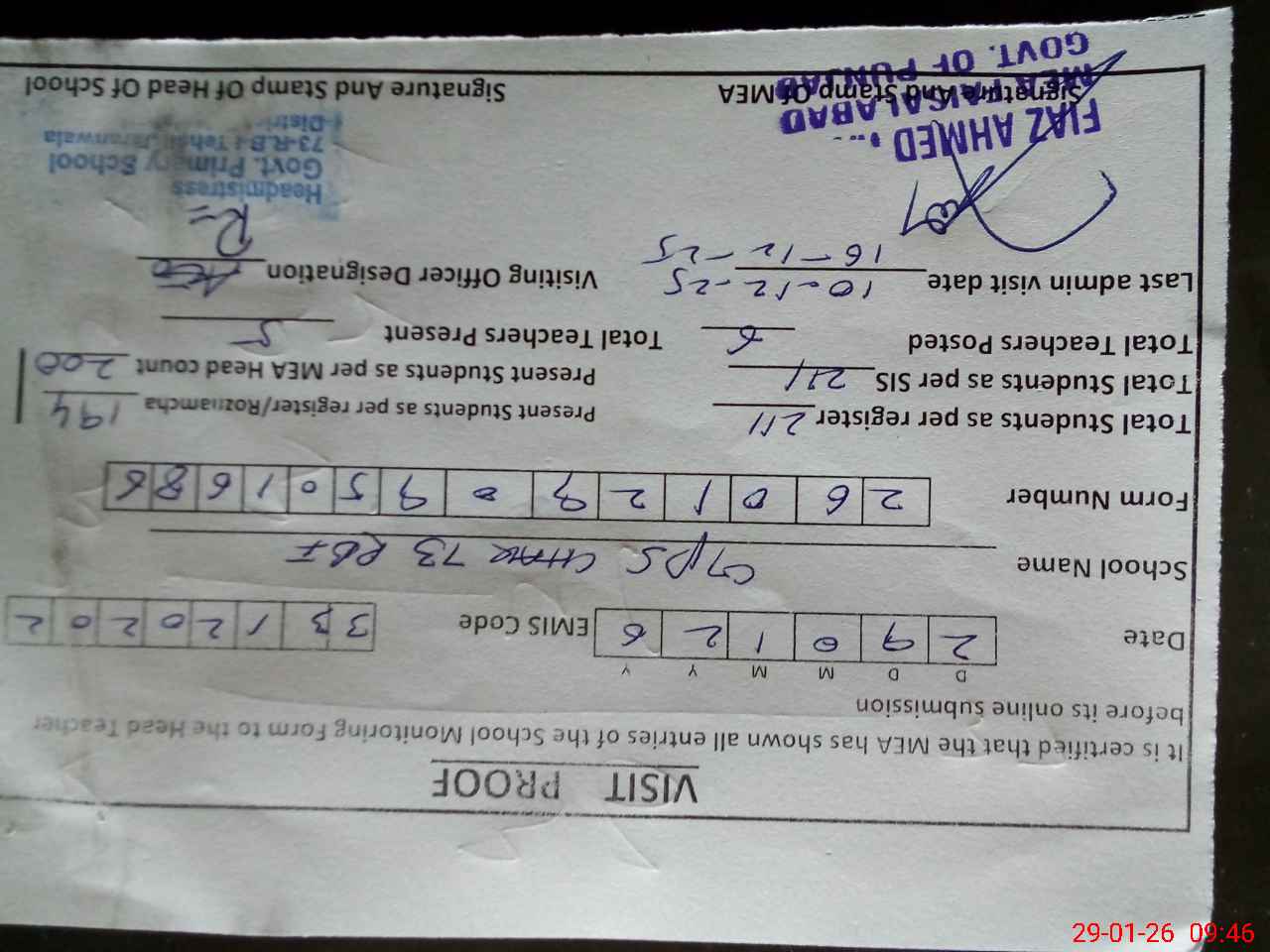 | Certified that this School was Inspected by the Undersigned MEA/DMO Today and the Information Stated Above is as Per Record. | |||||
