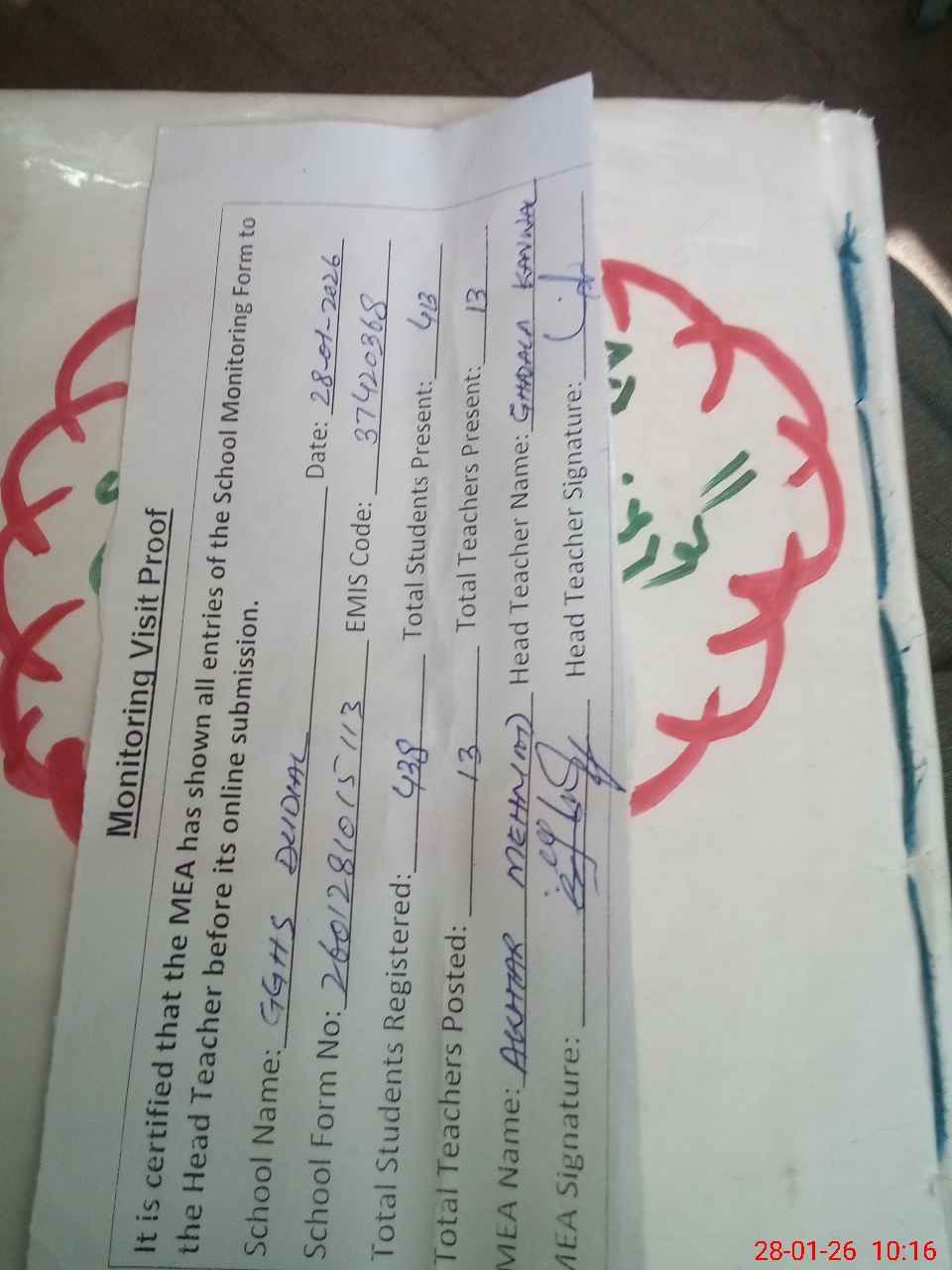 | Attendance Register | Head Teacher | MEA with School | Visit Proof |