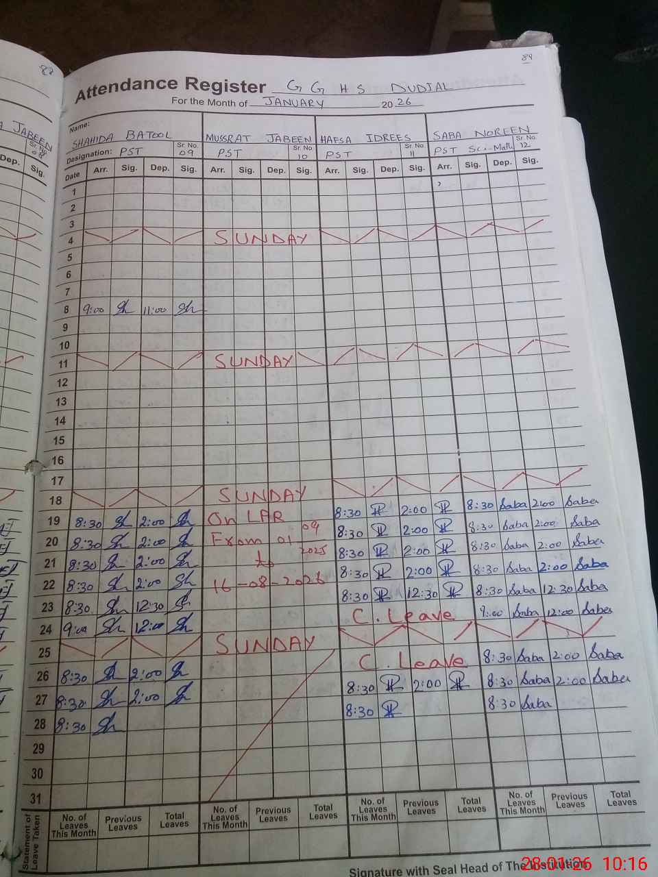 | Leave | Duty | Absent | Maternity | Medical | Ex- Pak |