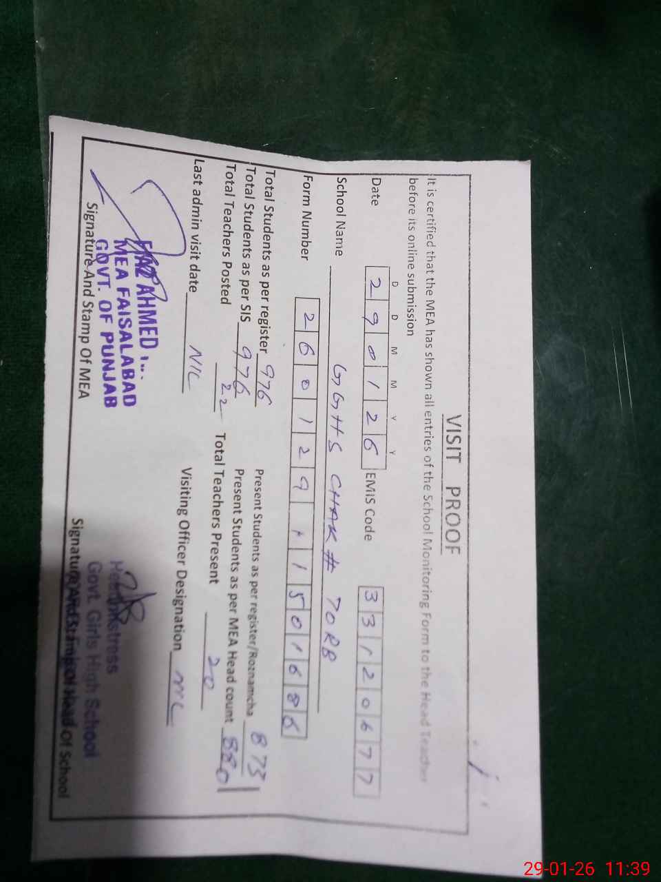 | Attendance Register | Head Teacher | MEA with School | Visit Proof |