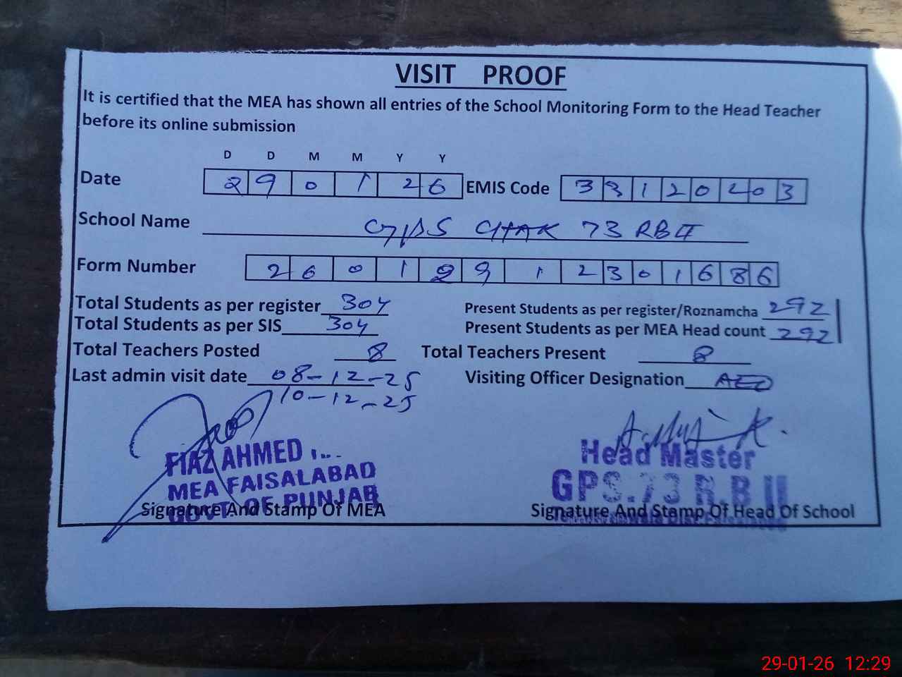 | Attendance Register | Head Teacher | MEA with School | Visit Proof |