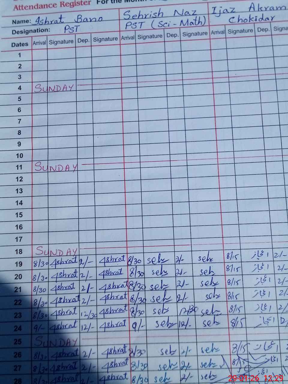 | CNIC | Full Name | Designation | R/C | Absence During Last Calender Month |