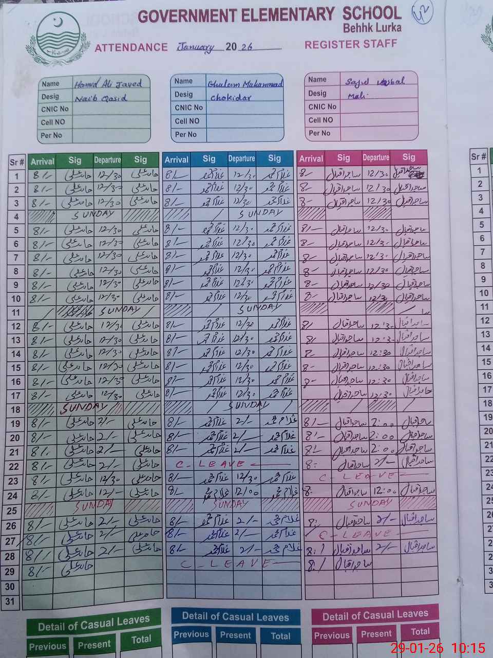 | CNIC | Full Name | Designation | R/C | Absence During Last Calender Month |