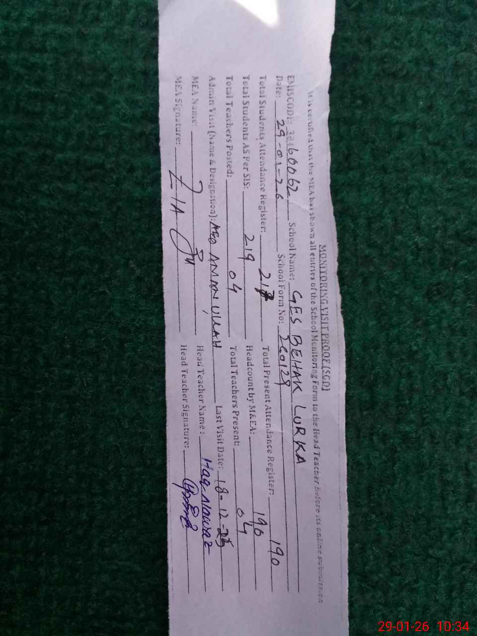 | Attendance Register | Head Teacher | MEA with School | Visit Proof |