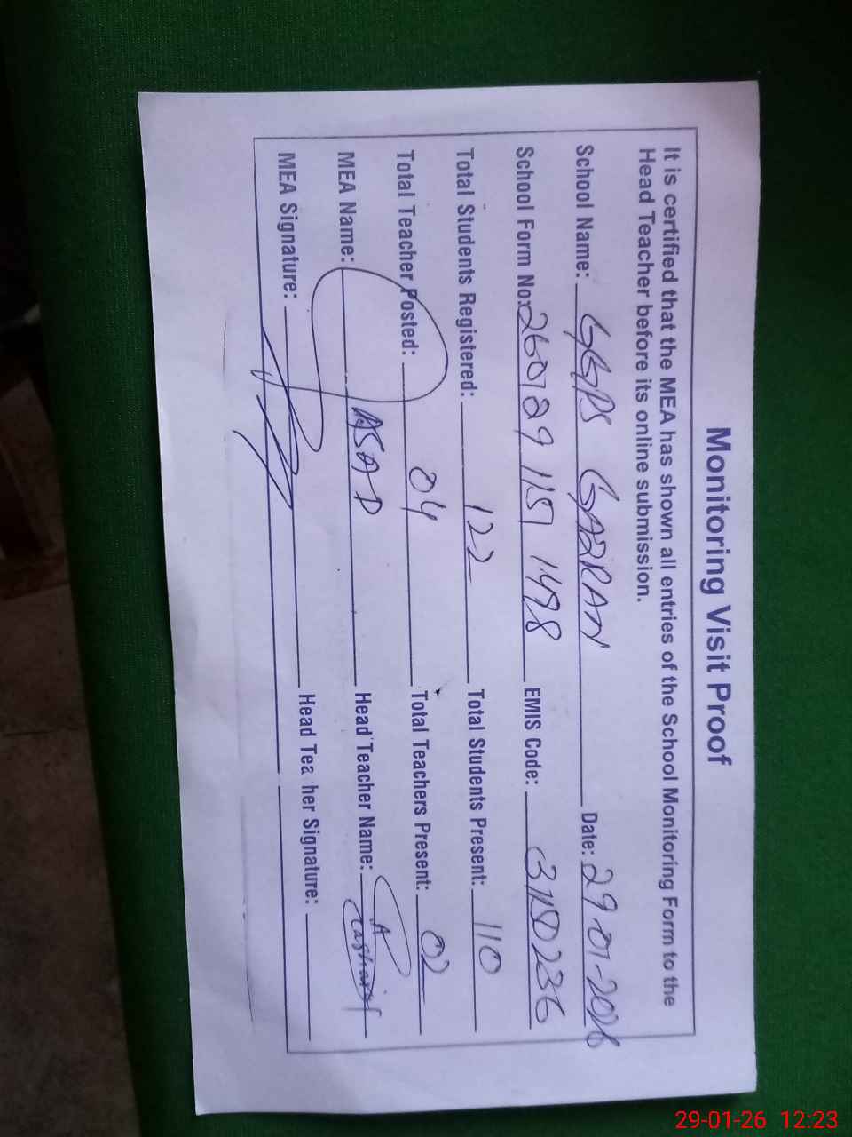 | Attendance Register | Head Teacher | MEA with School | Visit Proof |