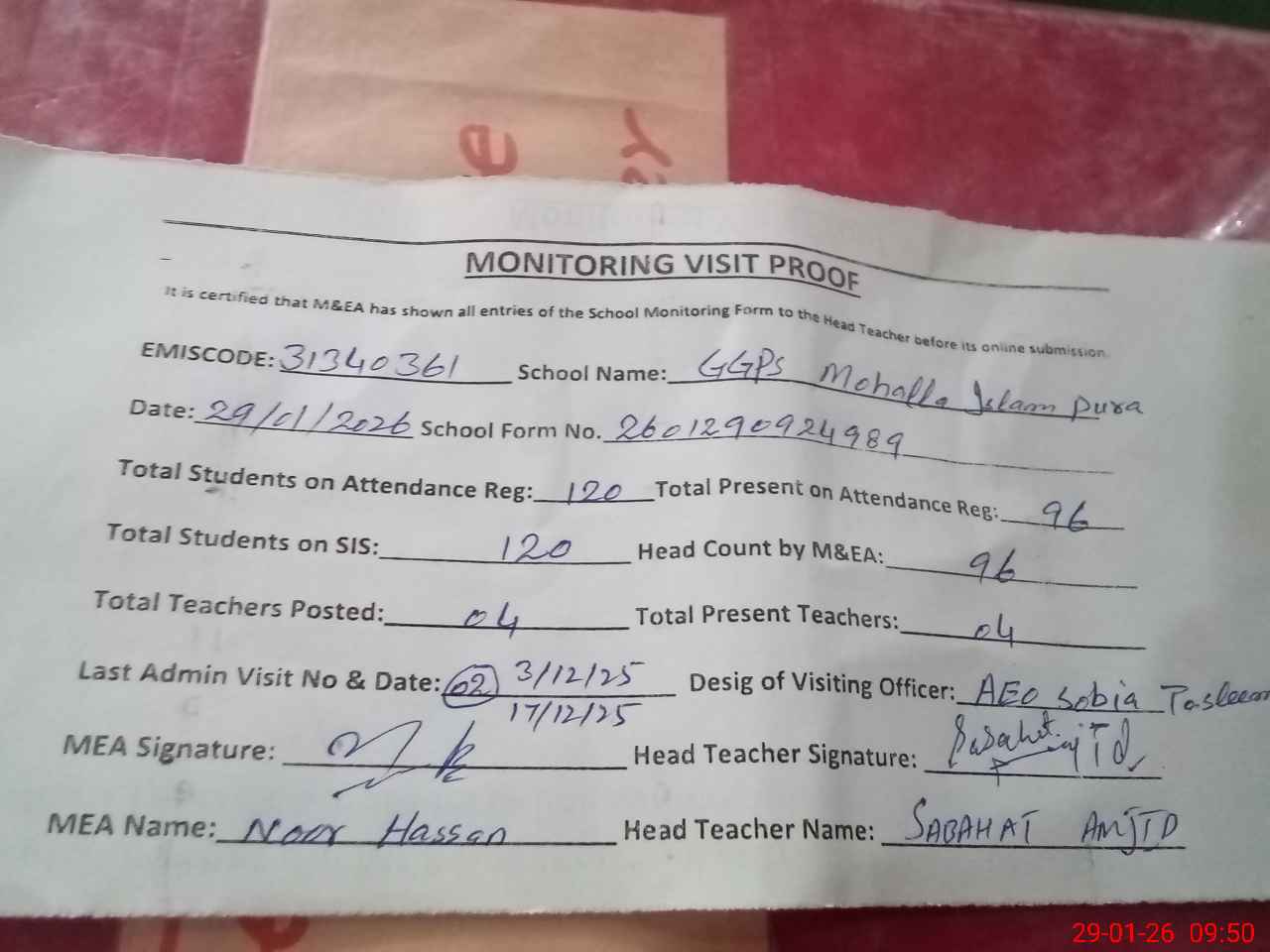 | Attendance Register | Head Teacher | MEA with School | Visit Proof |
