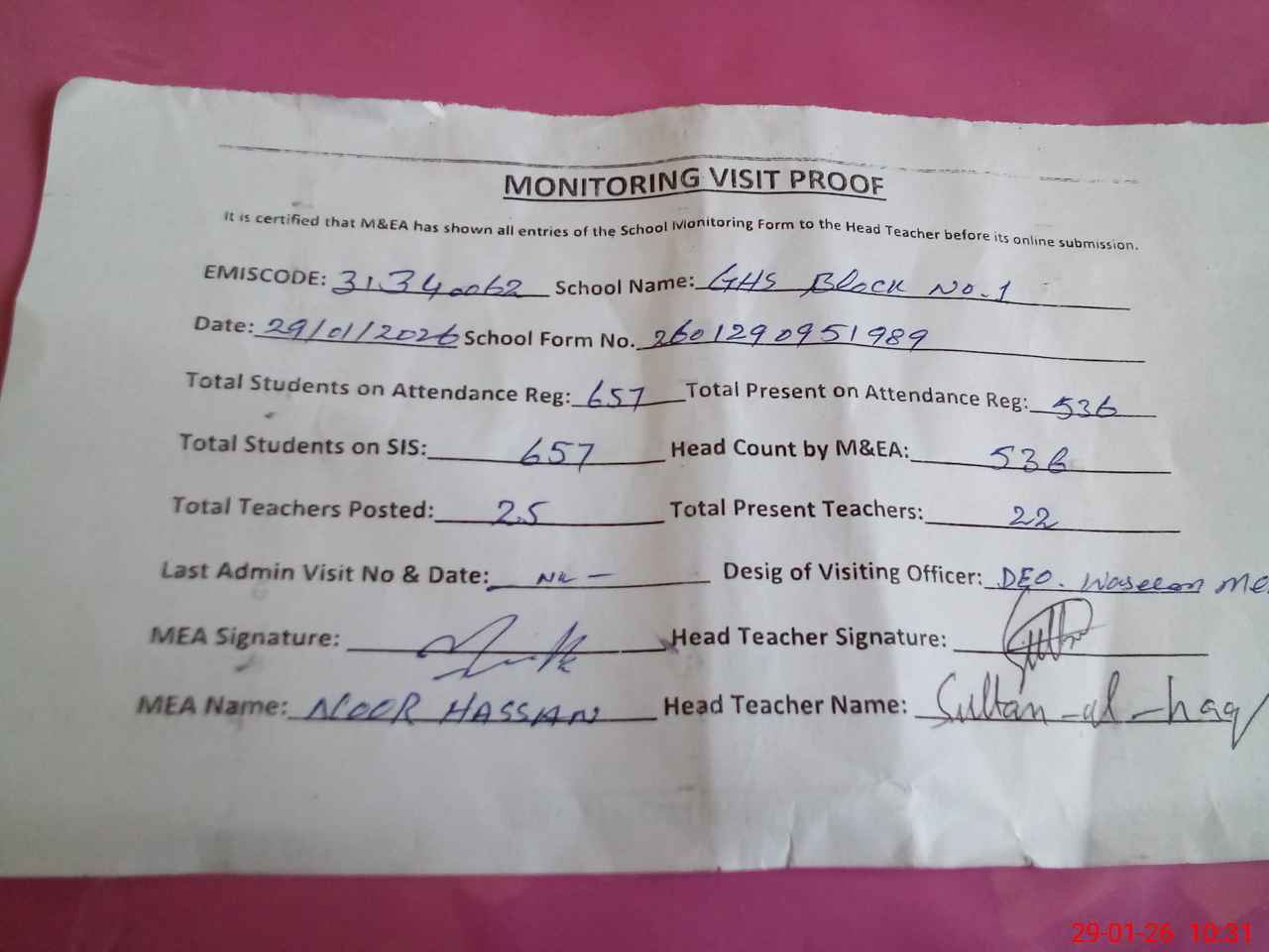 | EMIS Code: 31340062 | Name of School: GHS BLOCK NO.1 | |||