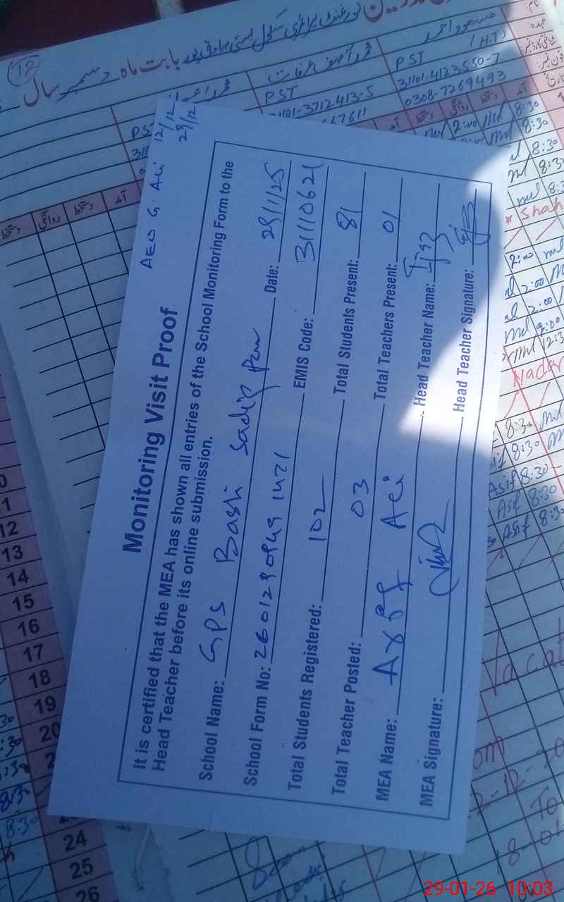 | Attendance Register | Head Teacher | MEA with School | Visit Proof |