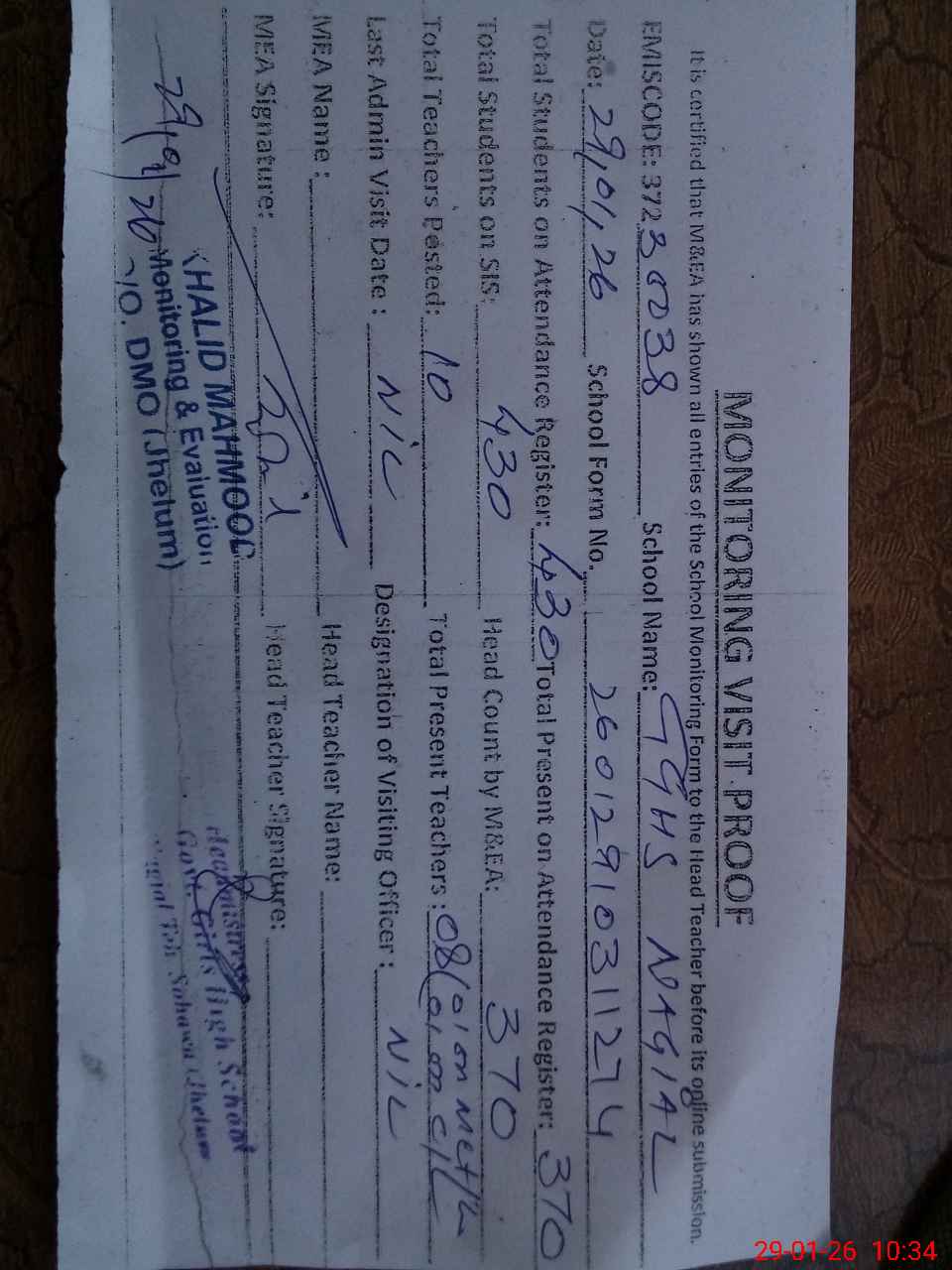 | Attendance Register | Head Teacher | MEA with School | Visit Proof |