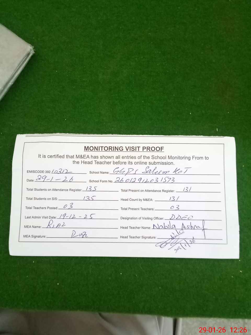 | Attendance Register | Head Teacher | MEA with School | Visit Proof |