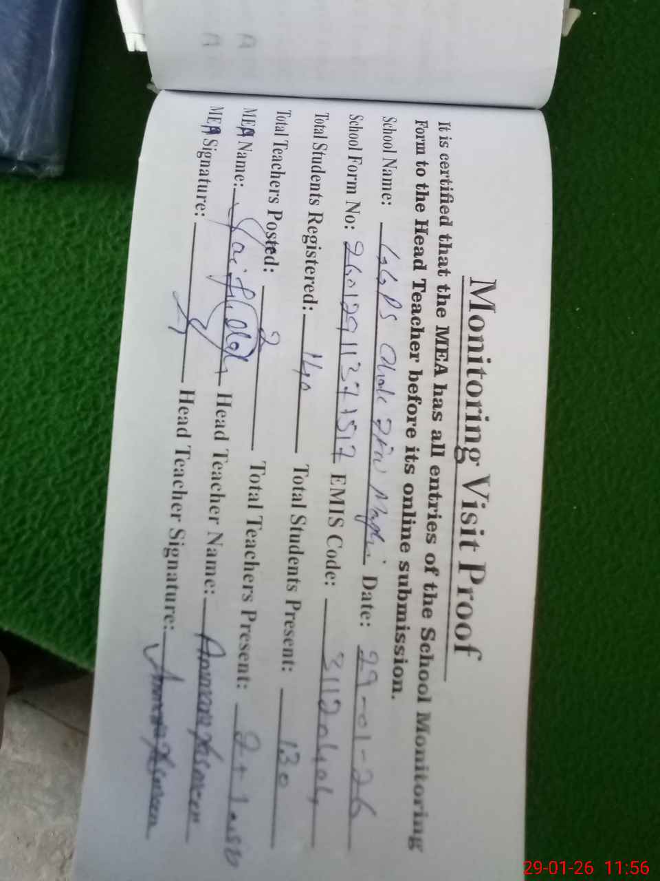 | Attendance Register | Head Teacher | MEA with School | Visit Proof |