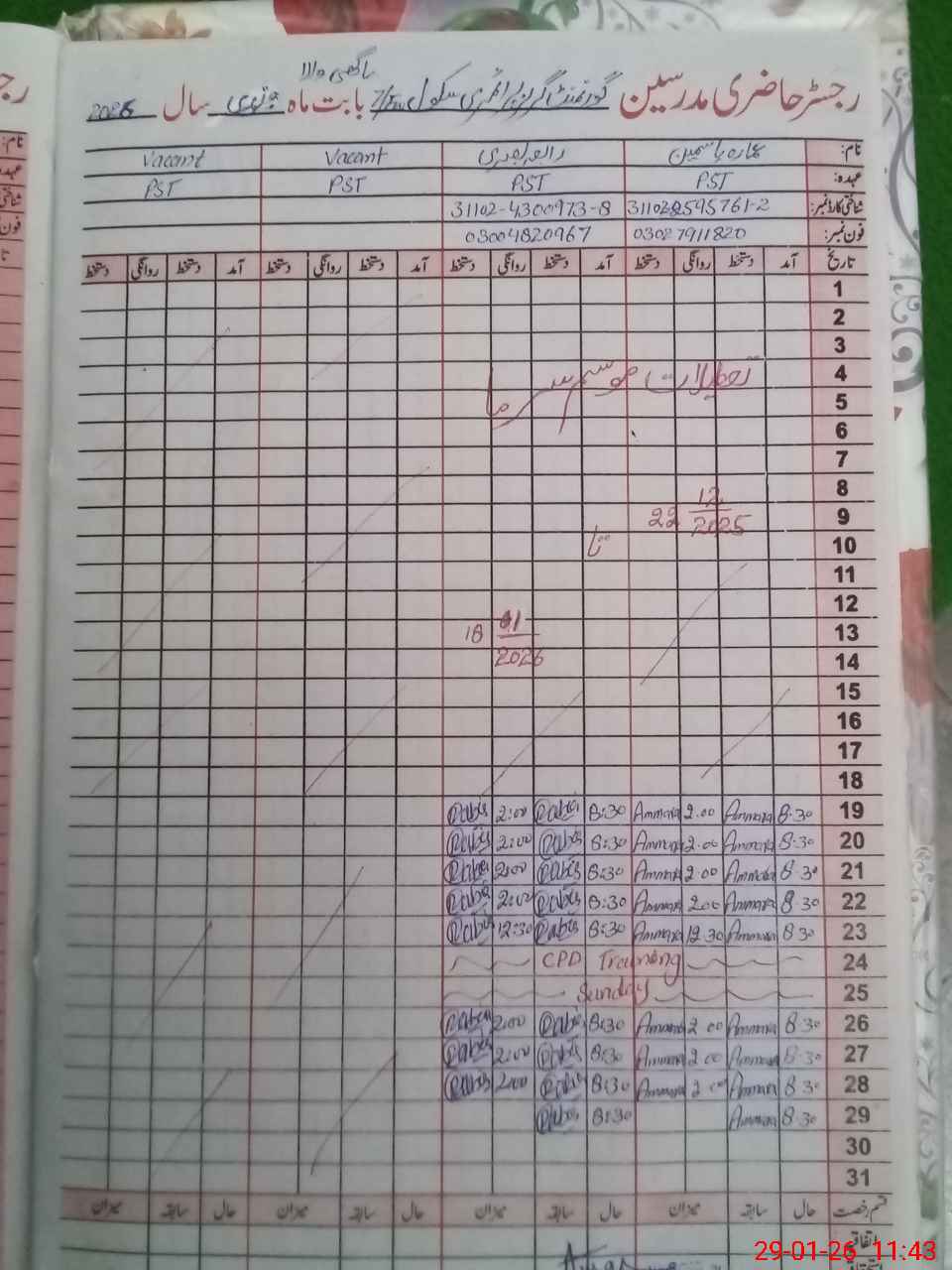 | CNIC | Full Name | Designation | R/C | Absence During Last Calender Month |