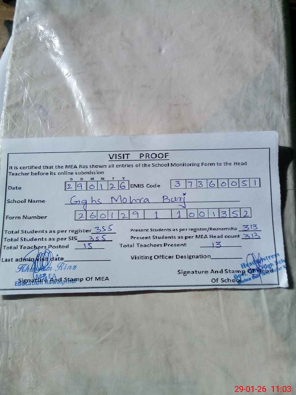 | Attendance Register | Head Teacher | MEA with School | Visit Proof |