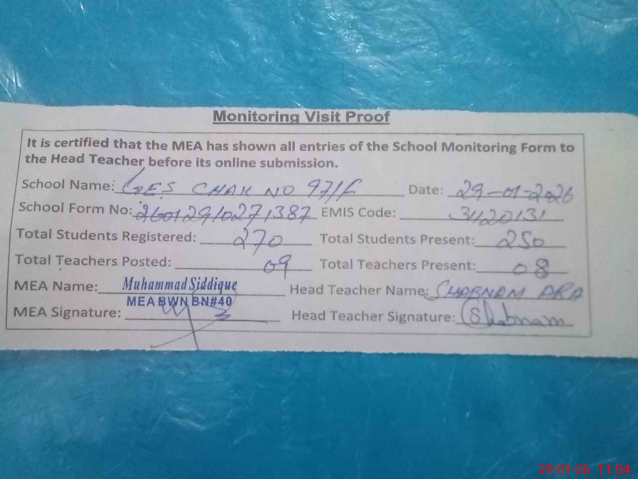 | Attendance Register | Head Teacher | MEA with School | Visit Proof |