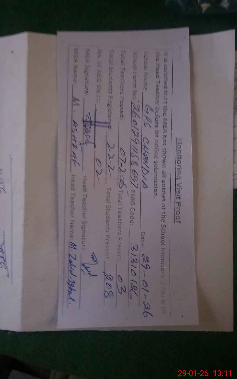 | EMIS Code: 31310186 | Name of School: GPS CHANDIA (After Noon) | |||