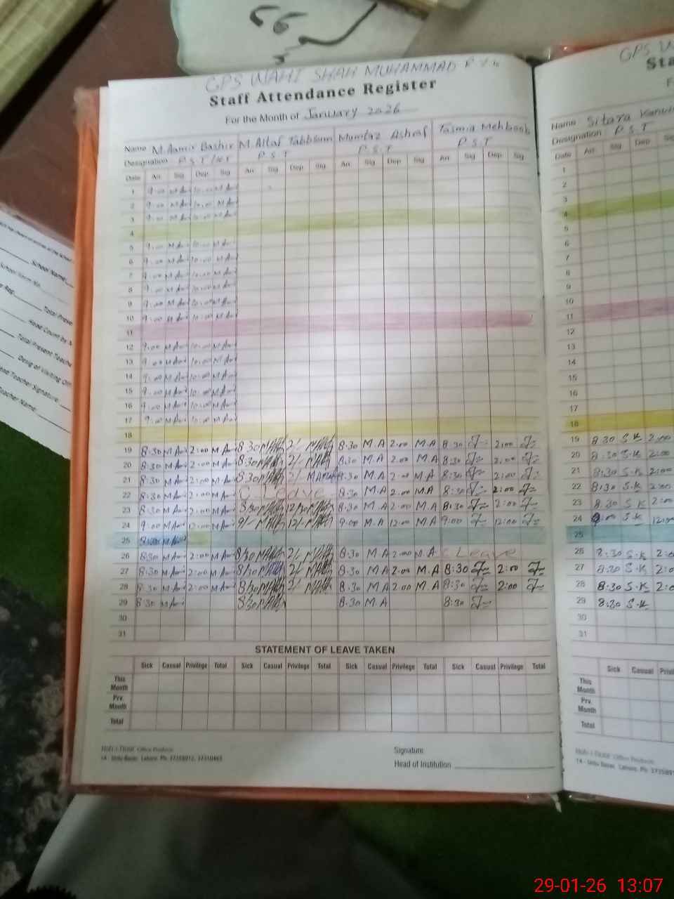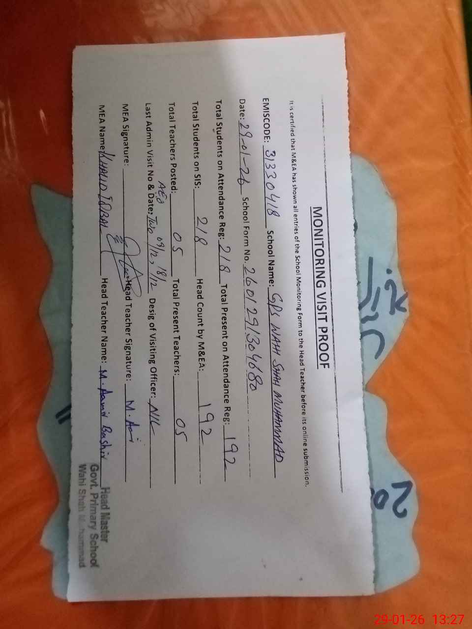 | Attendance Register | Head Teacher | MEA with School | Visit Proof |