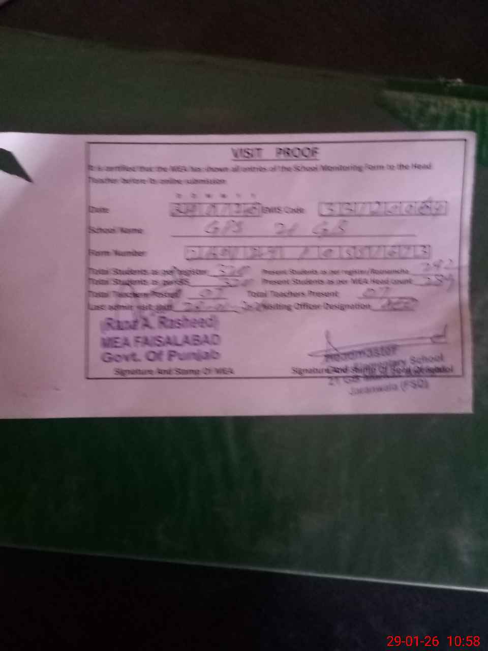 | Attendance Register | Head Teacher | MEA with School | Visit Proof |