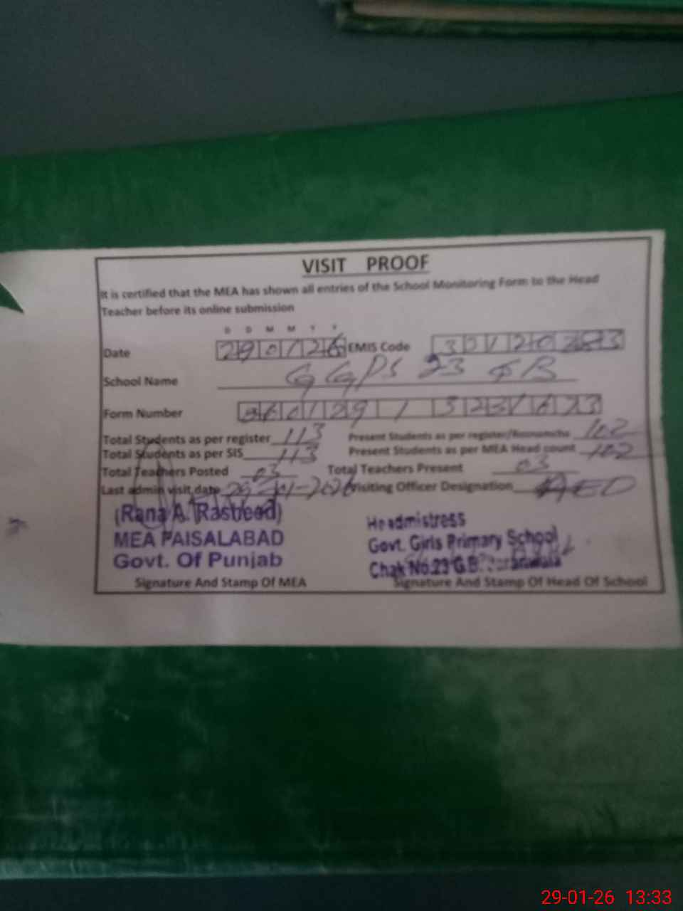 | EMIS Code: 33120383 | Name of School: GGPS CHAK 23 GB JARANWALA | |||
