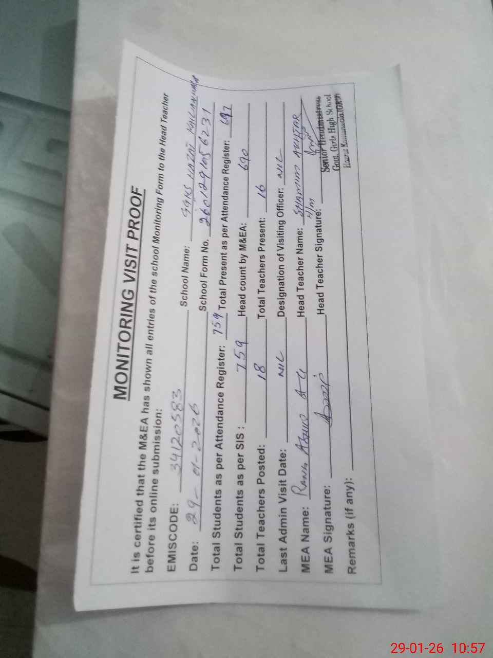 | Attendance Register | Head Teacher | MEA with School | Visit Proof |