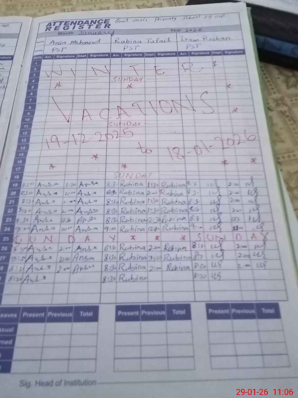 | CNIC | Full Name | Designation | R/C | Absence During Last Calender Month |