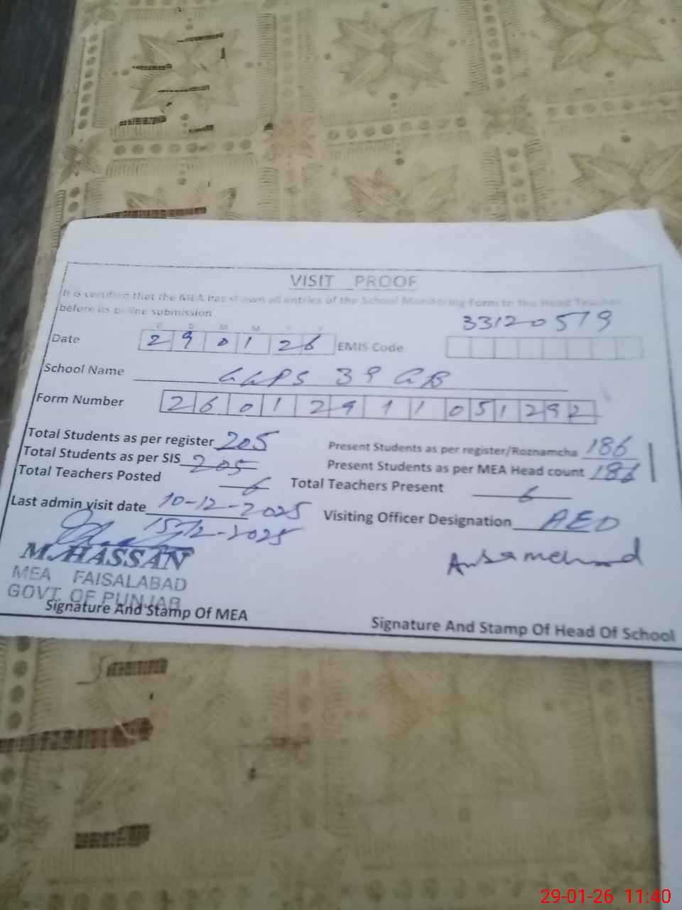 | Certified that this School was Inspected by the Undersigned MEA/DMO Today and the Information Stated Above is as Per Record. | |||||