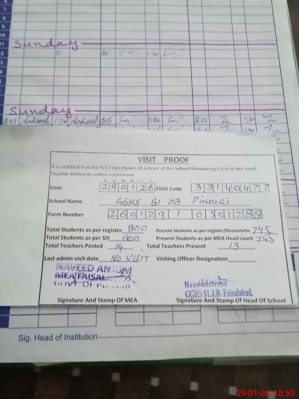 | Attendance Register | Head Teacher | MEA with School | Visit Proof |
