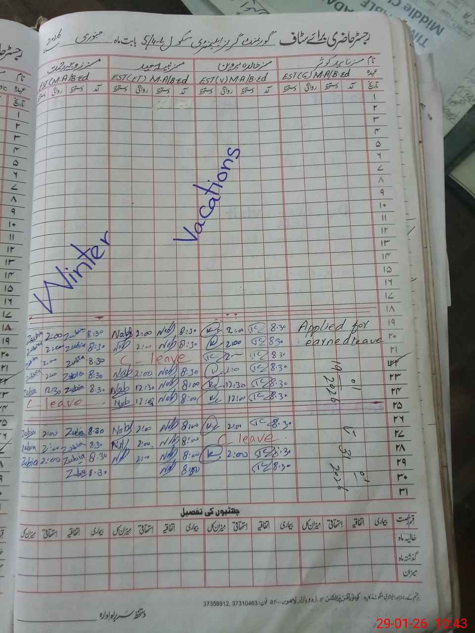 | 35**** | Ta**** Ya**** | PST | Regular | 4 | 0 | 0 | 0 | 0 | 0 | 0 | 0 | 4 | Maternity |