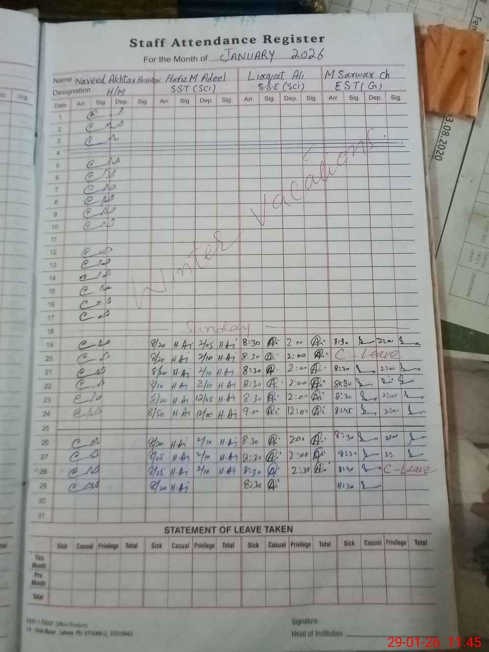 | CNIC | Full Name | Designation | R/C | Absence During Last Calender Month |