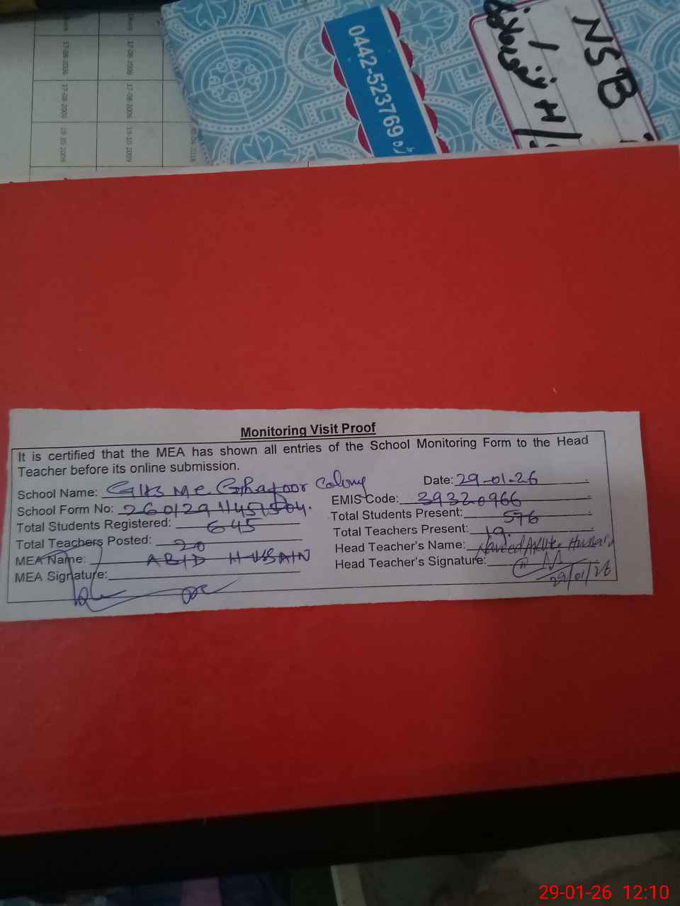 | Attendance Register | Head Teacher | MEA with School | Visit Proof |