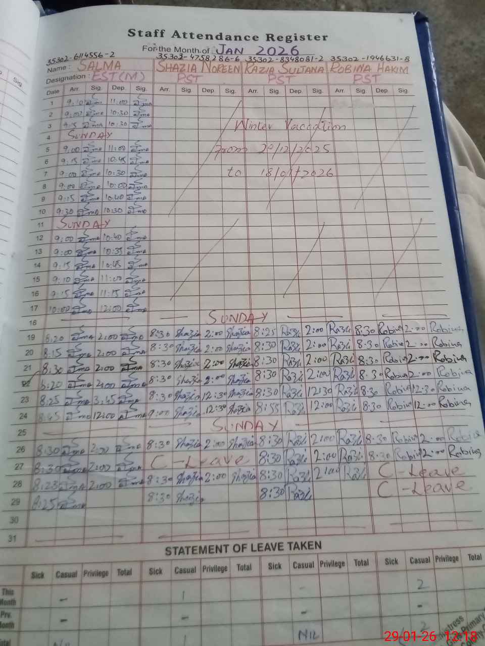 | CNIC | Full Name | Designation | R/C | Absence During Last Calender Month |