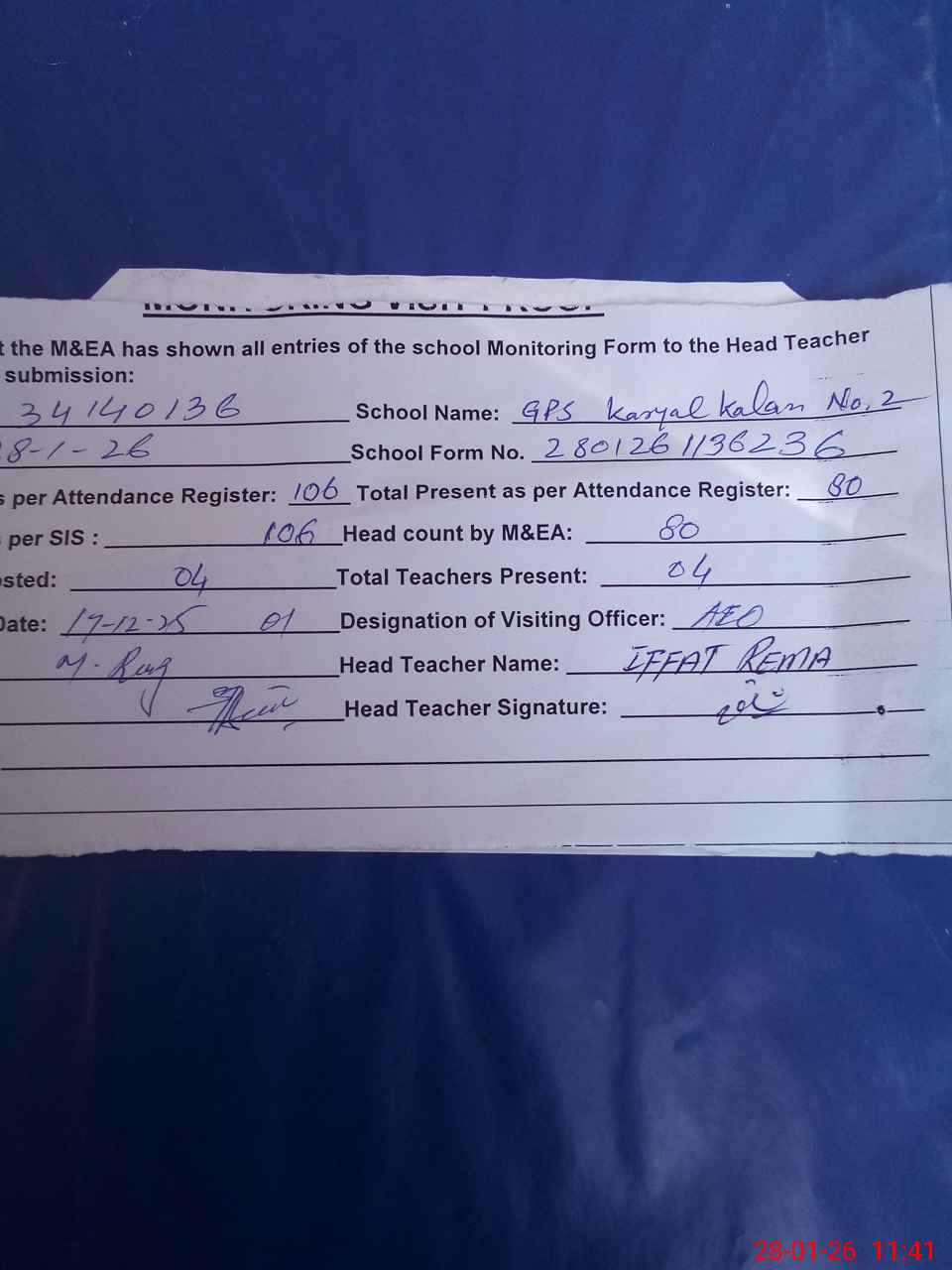 | Attendance Register | Head Teacher | MEA with School | Visit Proof |