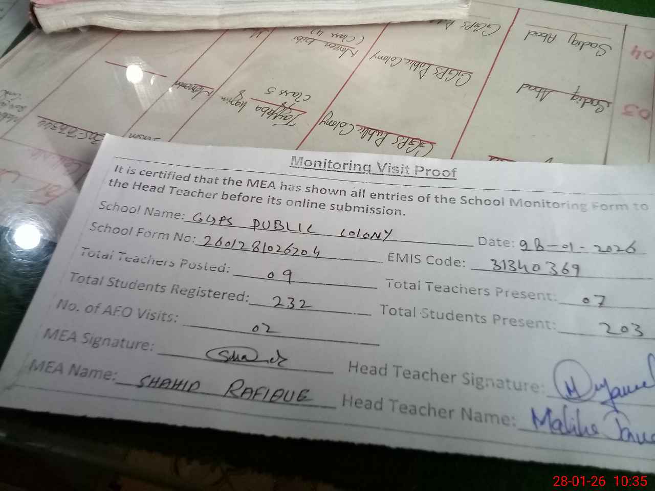 | Attendance Register | Head Teacher | MEA with School | Visit Proof |