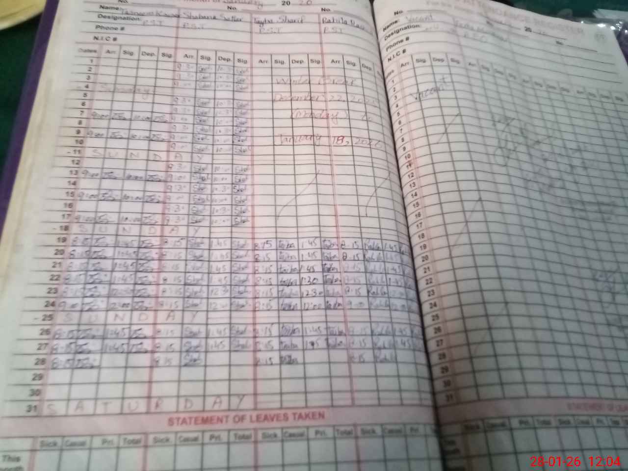 | CNIC | Full Name | Designation | R/C | Absence During Last Calender Month |