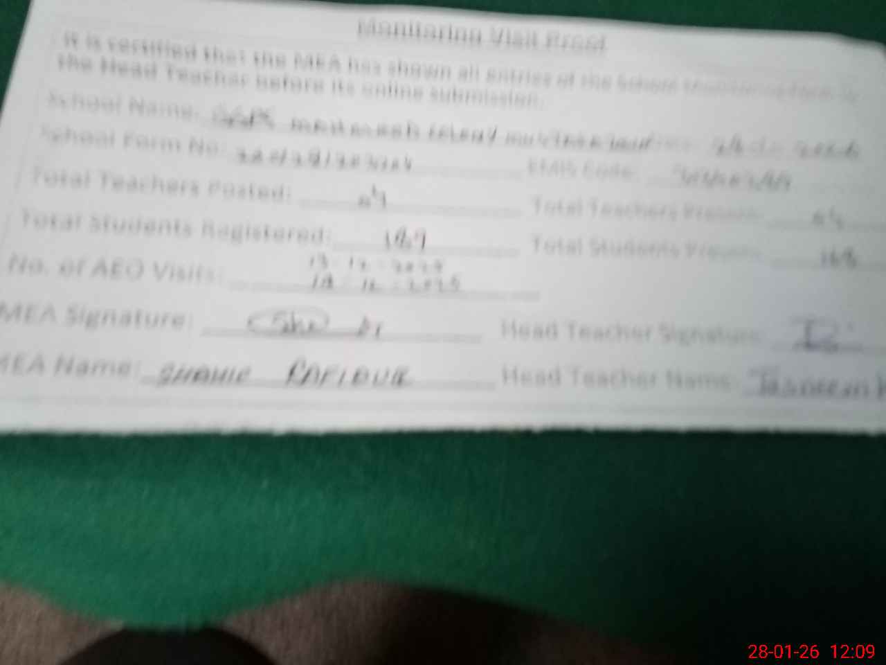 | Attendance Register | Head Teacher | MEA with School | Visit Proof |