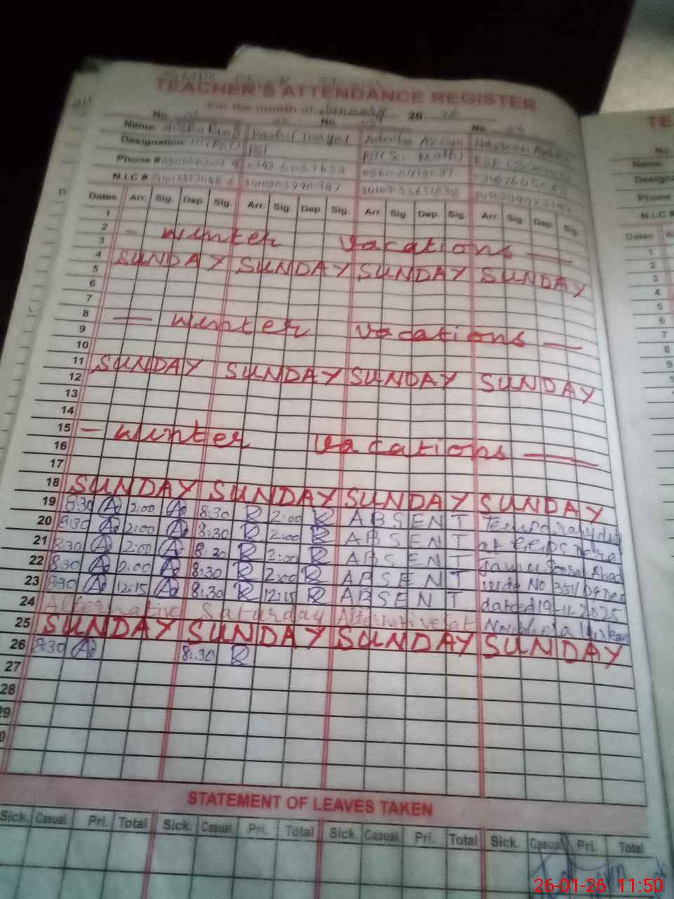 | CNIC | Full Name | Designation | R/C | Absence During Last Calender Month |